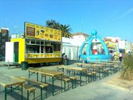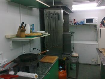 État neuf, a été utilisé une seule foispendant 5 jours. Entièrement équipée. Système anti-vol, compteur électrique, 32 A, chauffe eau 10 I, évier double inox, évier lave-main 25 I. Évier spécial pour nettoyage ustensiles barbecues, double évier individuel qui s’installe en dehors de cuisine pour ranger l’équipement, compartiment spécial individuel pour les ballons de gaz avec le chauffage, les murs avec isolation thermique, VMI aux plafond, éclairage – lampes au néon, partout serrures avec la sécurité renforcée. Panneaux publicité réglable. Équipement : gril au gaz capacité 66 poulets,tiges spéciales pour cuisses de poulets, tout ustensiles nécessaires pour cuir la viande de manière différentes camera thermique, 6 compartiments pour les salades, gazinière, ustensiles pour faire les frites, bouilloire électrique, micro-onde, four, frigo,congélateur, étagères , penderie, tables et chaises pliables pous 110 personnes, 2 tentes 6 x 3 m.