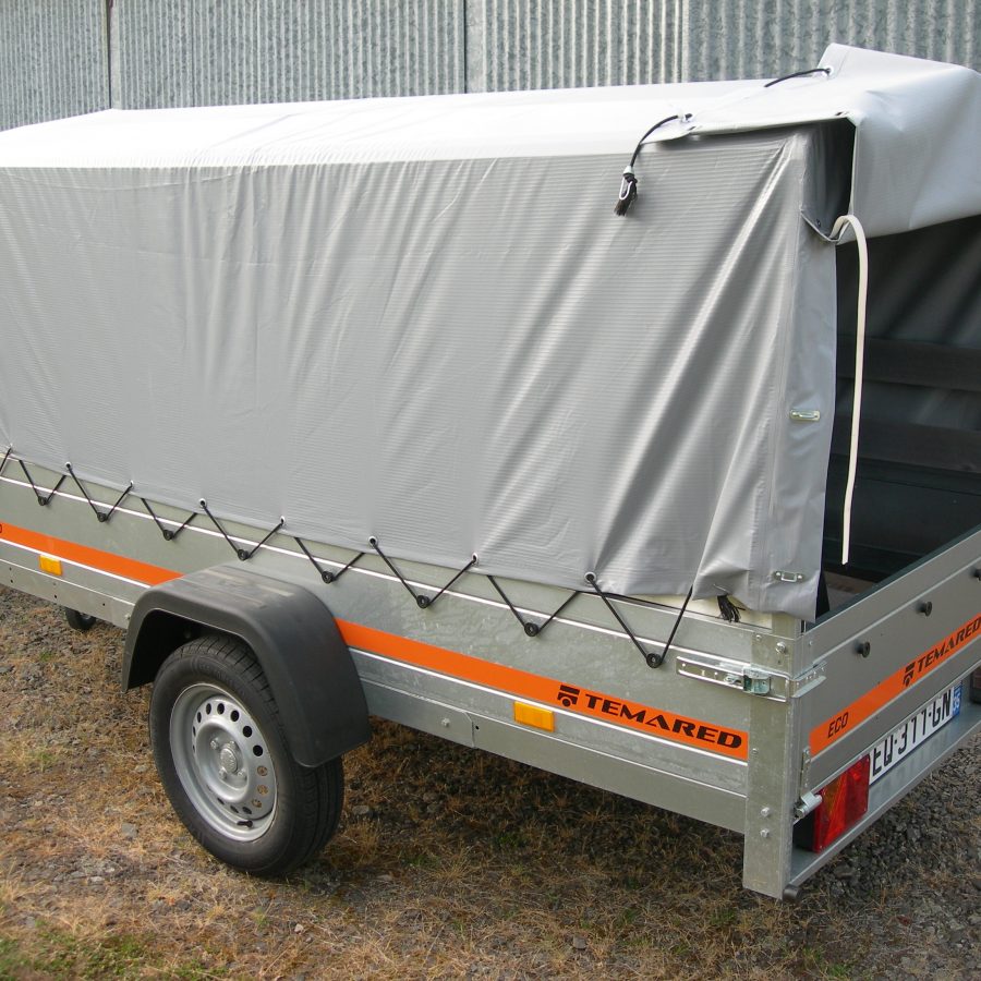 Remorque avec très grande capacité de chargement car nous avons fait faire des renforcements latéraux en aluminium pour pouvoir charger la remorque jusqu’en haut de la bâche ( voir photos ).