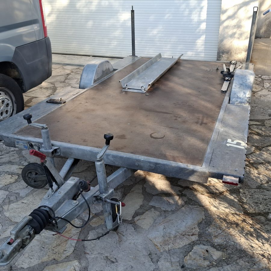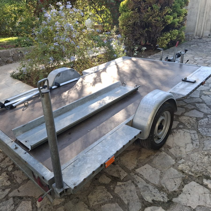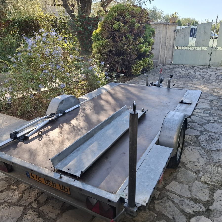 Remorque plateau – 1 essieu – PTAC 700 kgs – freinée – surface utile 1440 x 2940 cm – chassis en profilés soudés et galvanisés à chaud – roue de secours – 2 roues jokey – plancher multiplis marine – 2 rampes de montée – bon état – toujours stockée à l’intérieur – utilisée pour 2 quads – 1.000 €