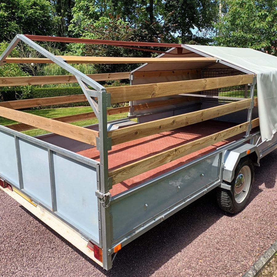 REMORQUE AVEC CARTE GRISE , AVEC BACHE NEUVE ET RIDELLE AVANT DROITE RABATTABLE