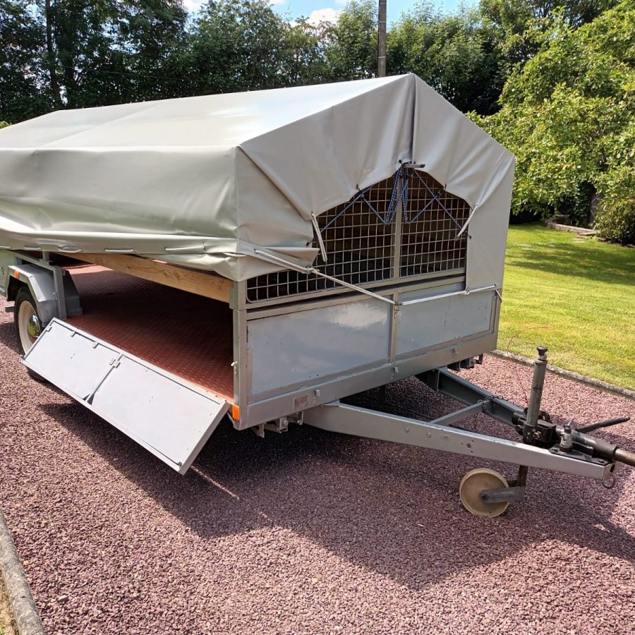 A VENDRE REMORQUE AVEC CARTE GRISE , AVEC BACHE NEUVE ET RIDELLE AVANT DROITE RABATTABLE .