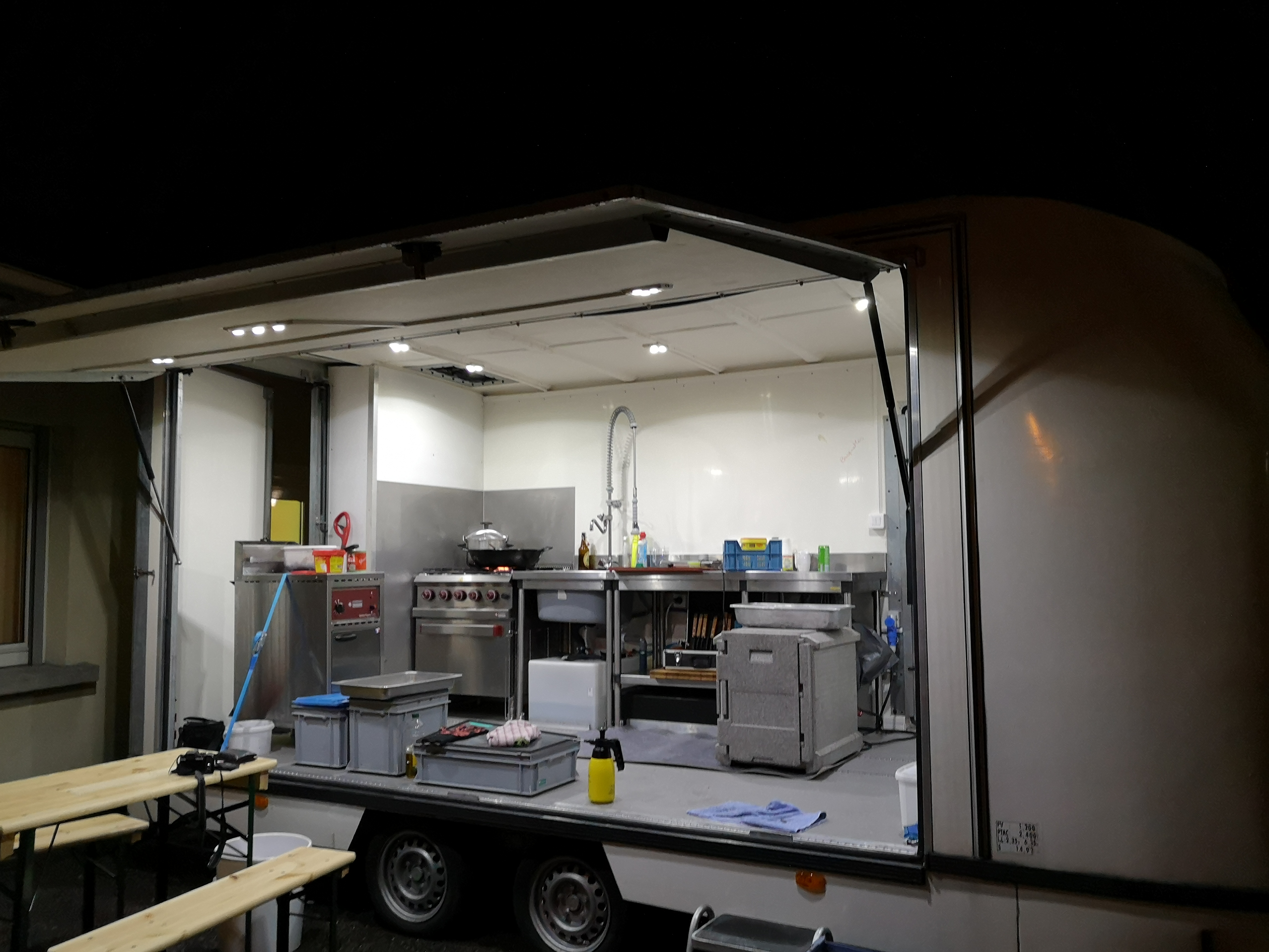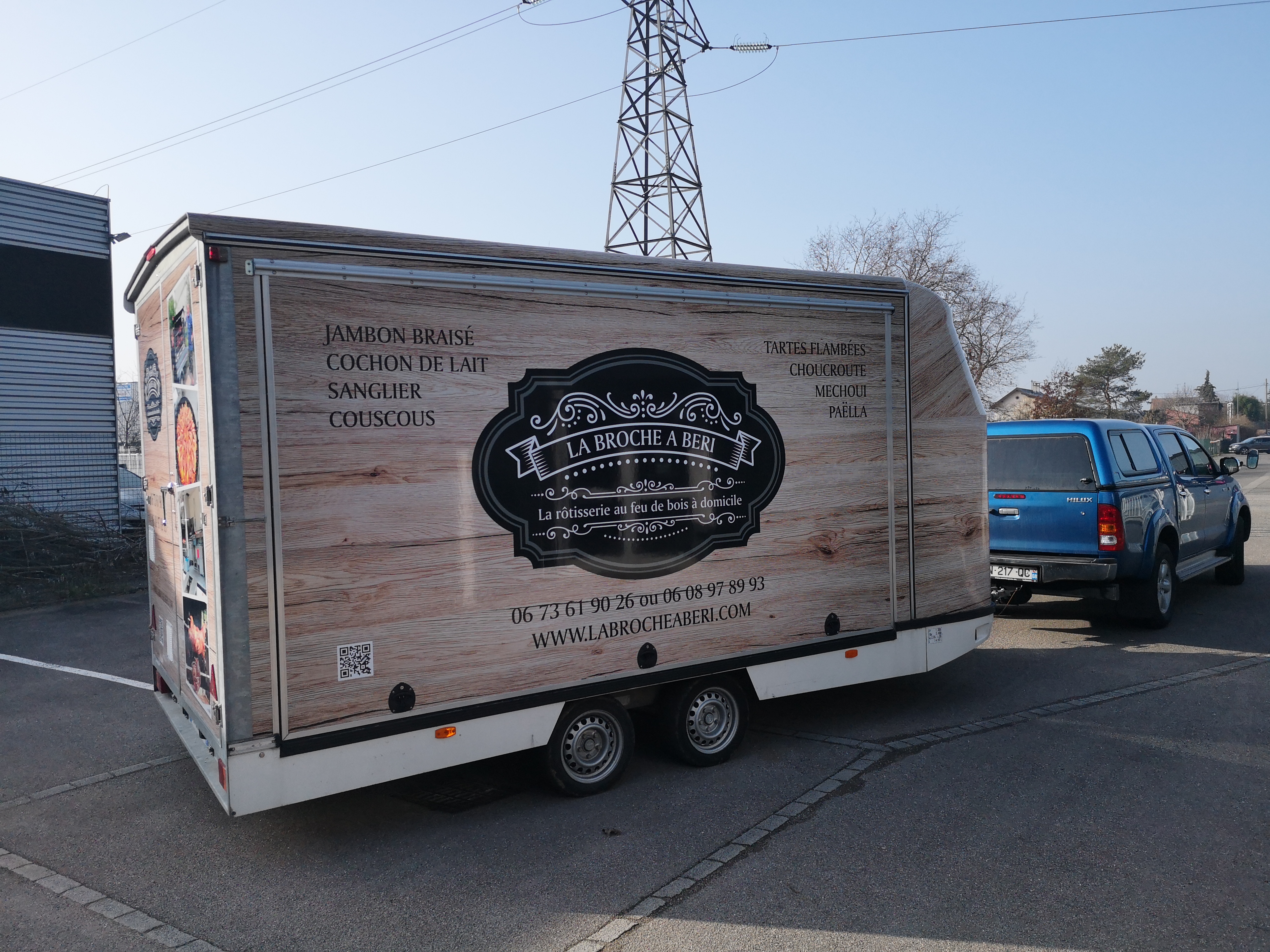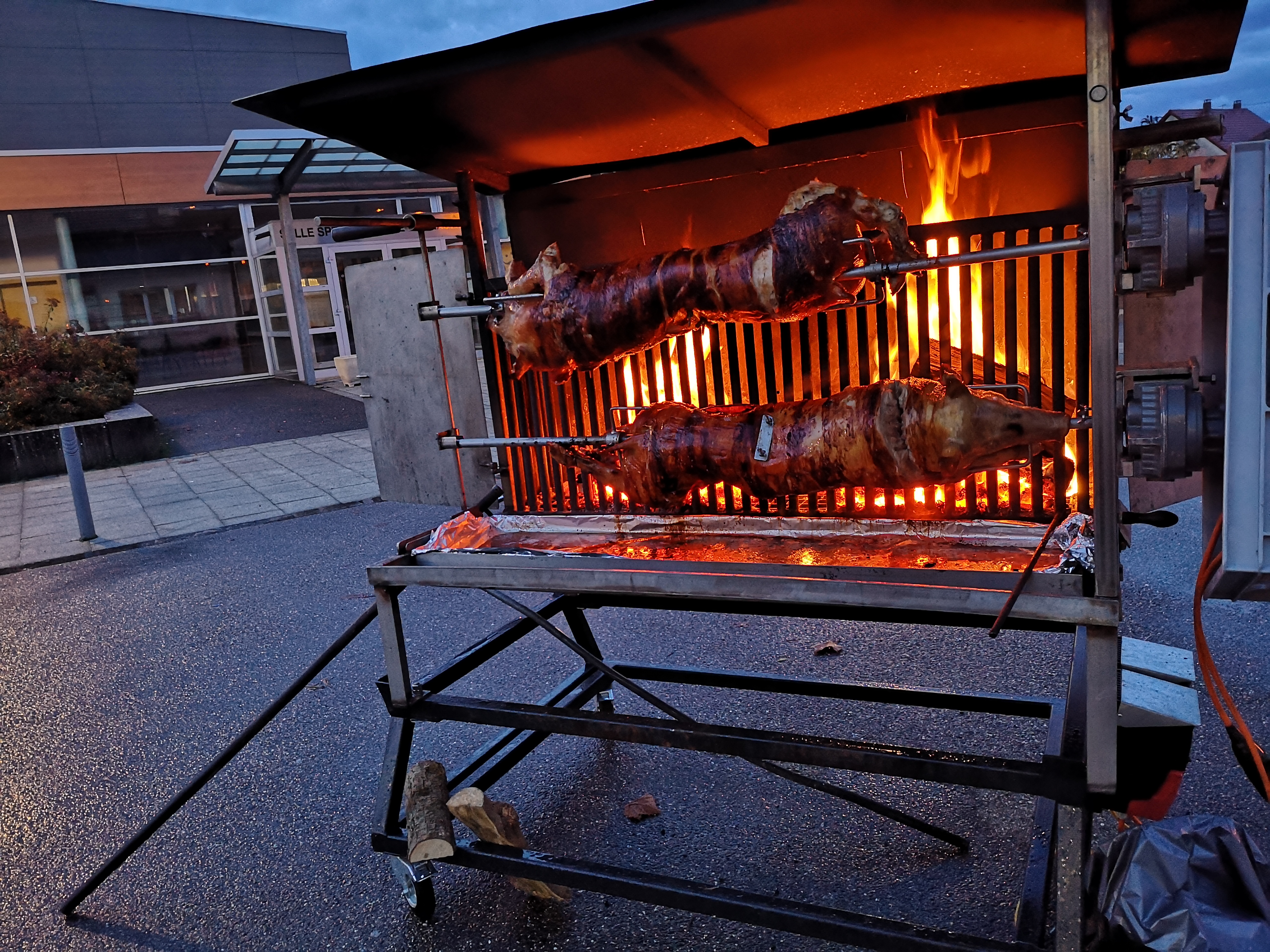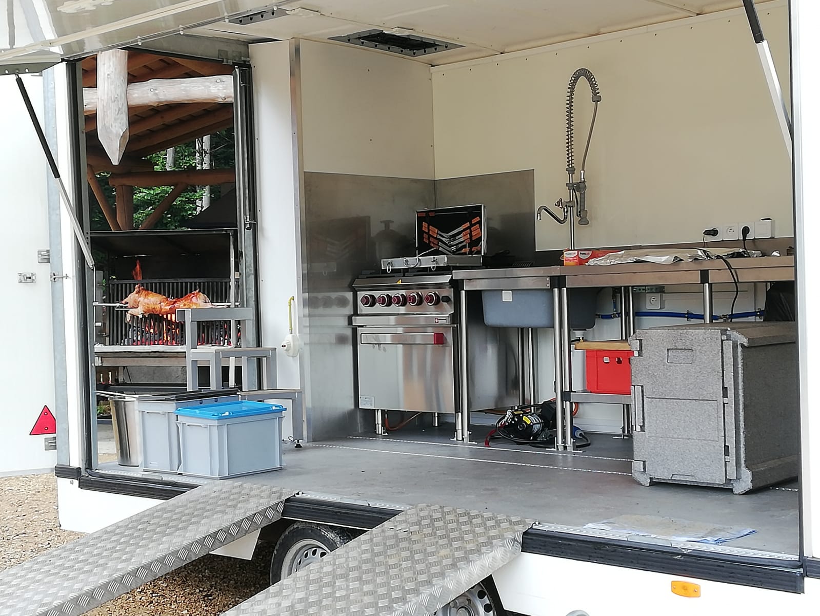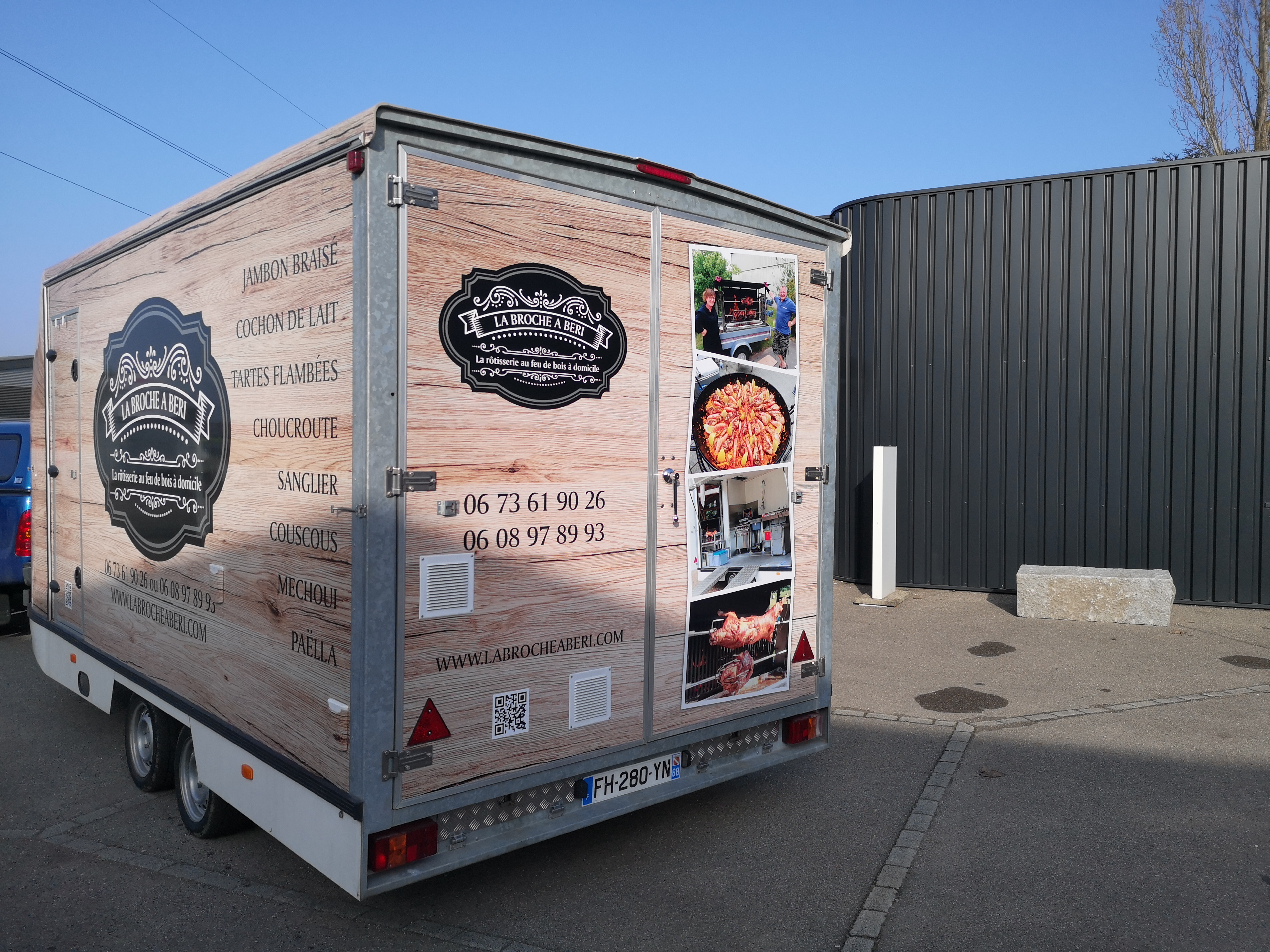 Cause départ en retraite , je vends tout mon équipement , et carnet clientèle 68,67,90,25. l’équipement se compose d’une remorque de L 6.30x l 2.50xh 2.70,la remorque est équipée d’un piano gaz +four recevant 6/8 plats GN1 , une chambre froide de 2.5m², une plonge avec réserve d’eau (100 litres) ,un plan de travail inox. la remorque peut être branchée sur le réseau électrique privée (220v). en se branchant sur un tuyau de type » gardena » il est possible d’avoir de l’eau chaude en continu pour la plonge .comprends aussi l’éclairage LED. Ci joint photos du grill permettant de faire toutes sortes de viandes à la broche ,cochon de lait , sanglier ,pièce de boeuf , de veau ,Porc et poulets.