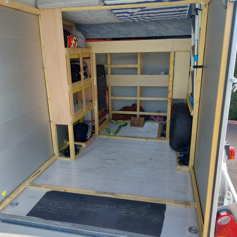Vends remorque Debon double essieux de janvier 2022 avec étagères sur mesure à l’intérieur.