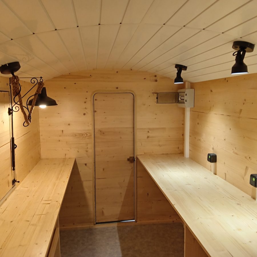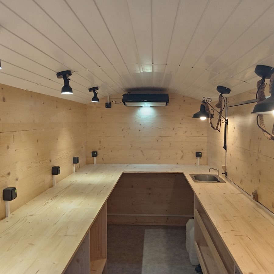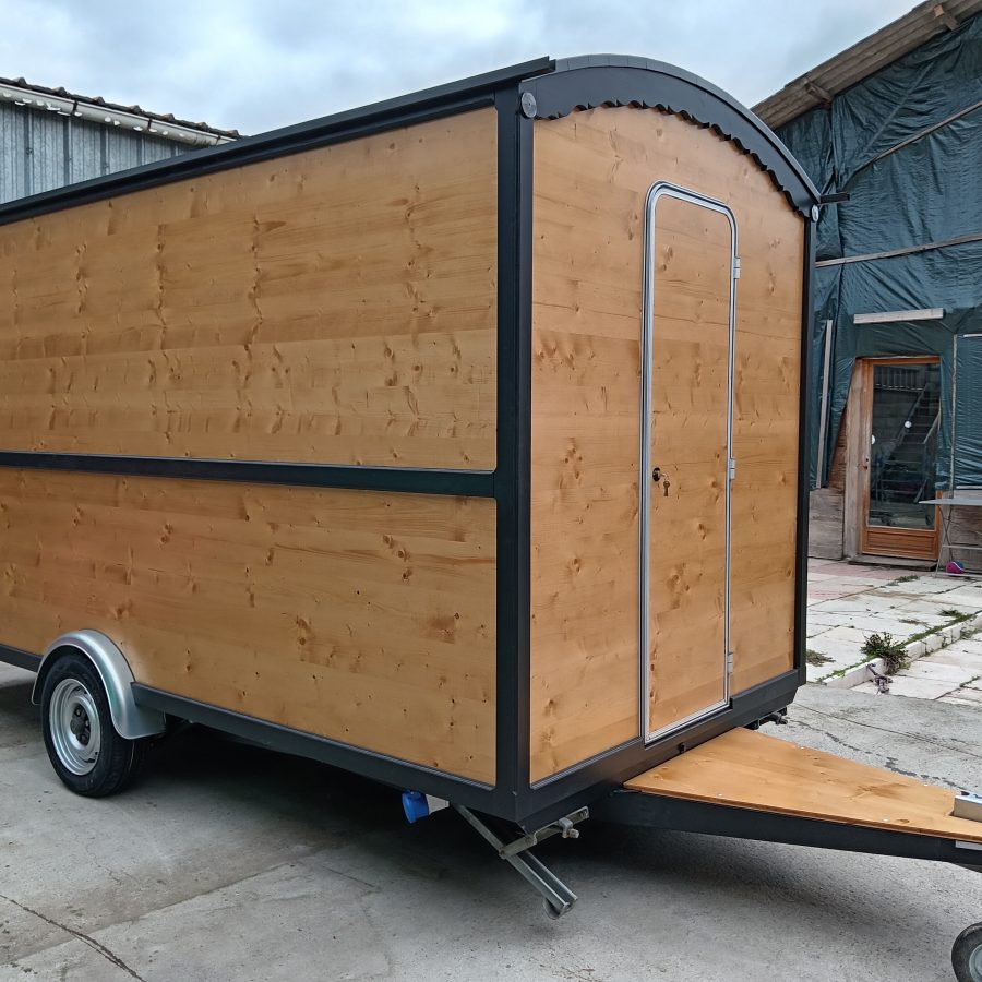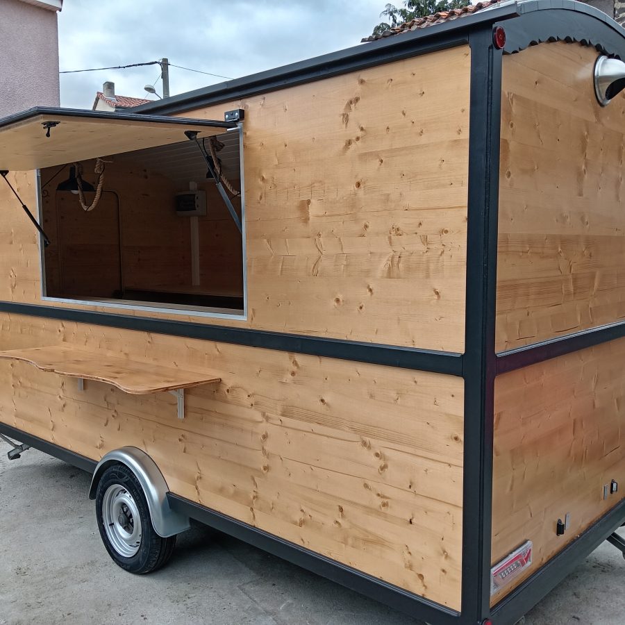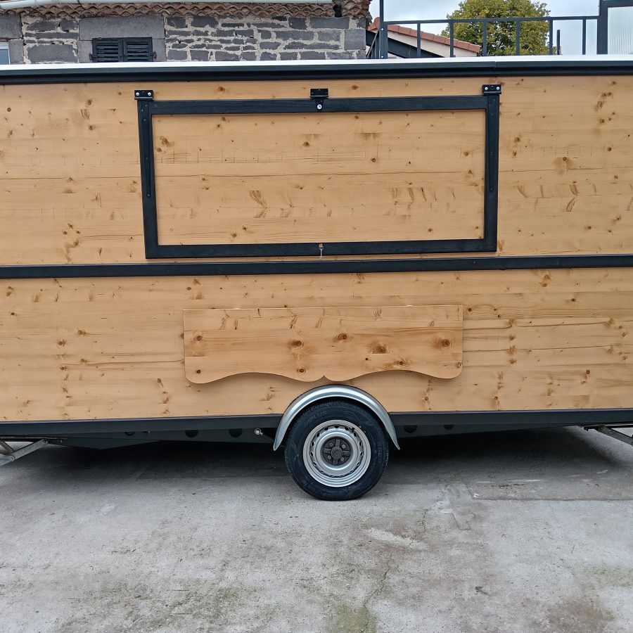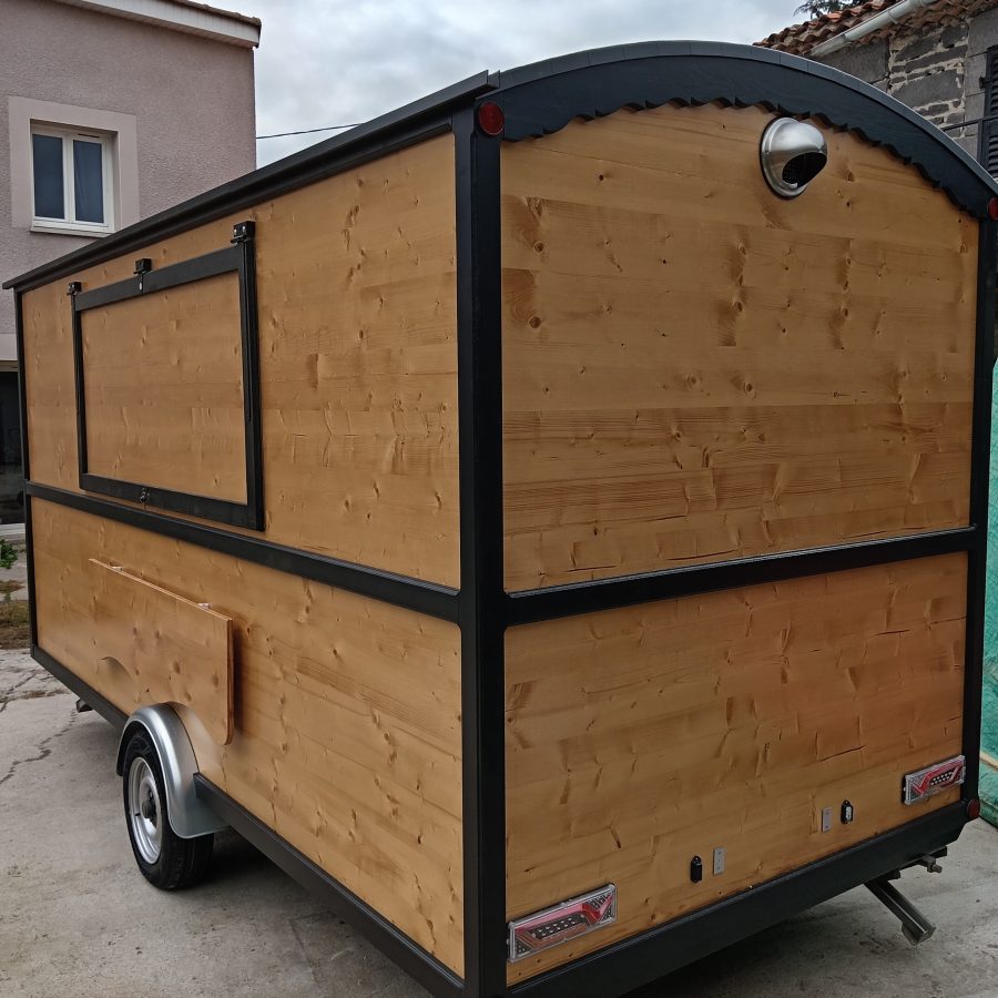 Remorque Food Truck style roulotte, neuve vendu avec certificat de carrossage et carte grise RESP magasin, chassis galvanisé PTAC de 900kg, Dimension extérieure du châssis 5 mètres 30 cm de long par 2 mètre de large au niveau des roues, hauteur total 2 mètre 48 cm. Dimension extérieure de la caisse 4 mètres de long par 1 mètre 84 de large, dimension intérieure 1 mètre 76 de large par 3 mètres 92 de long, hauteur sous plafond 1 mètre 98. L’intérieure est agencer de plan de travail d’une autre de 90 cm et divers rangements, vous disposer d’un lave main avec pompe a pied avec deux jerrican alimentaire une d’eau propre et une d’eau usé, raccordement électrique par l’extérieur au 220 V avec tableau électrique étanche, éclairage led, 6 prises sur les plan de travail, une hotte aspirante, 3 prises sous plan de travail pour frigo ou autre d’une hauteur 87 cm, une grande ouverture coté client de 1 mètres 80 cm de long par 80 cm de haut . Possibilité de rajouter le gaz si besoin.