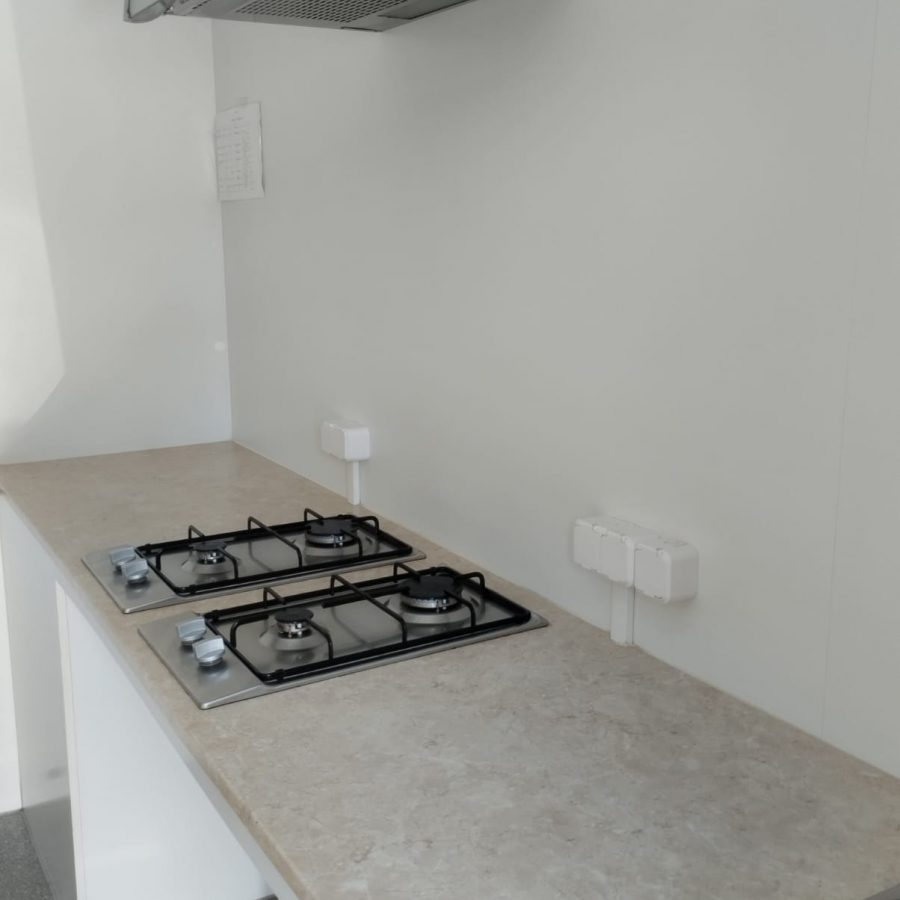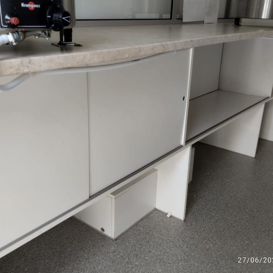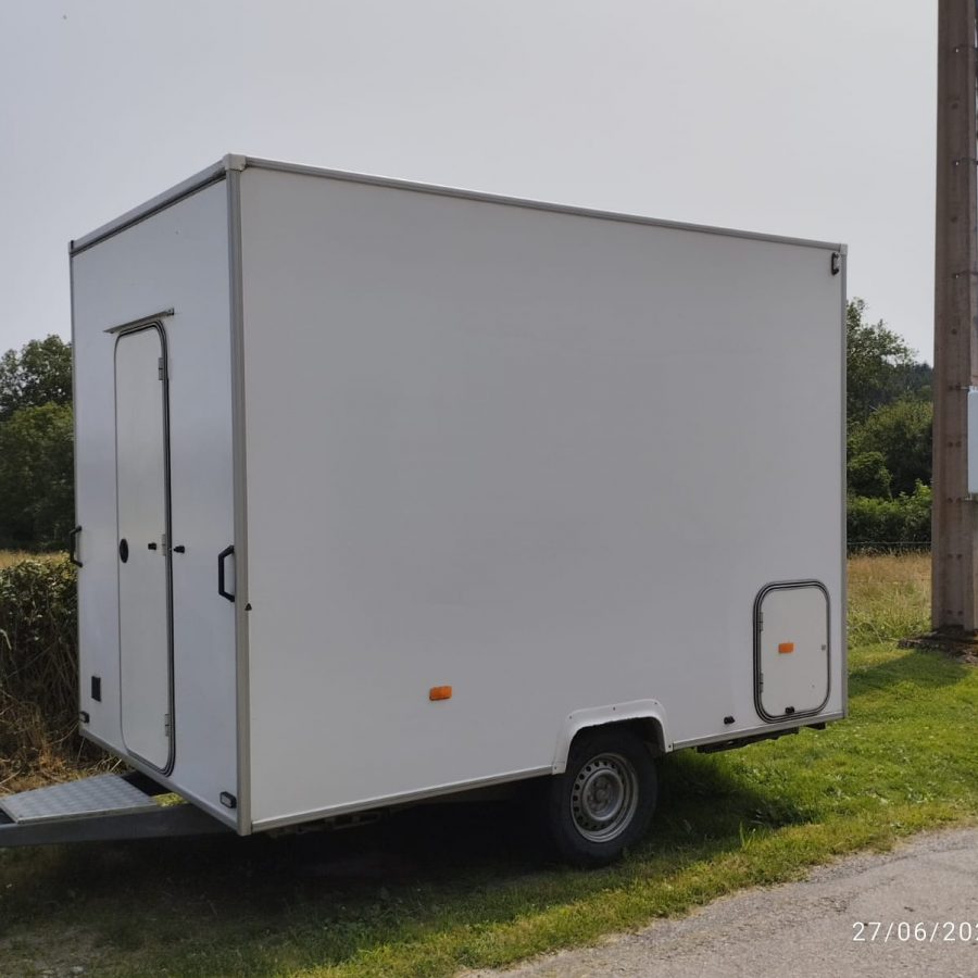 Remorque équipée avec tableau électrique + prises. Caisson étanche pour 2 bouteilles de gaz qui alimentent 2 crêpières Krampouz et 2 plaques de cuisson. 1 frigo, une hotte, 1 lave-main +accessoires.