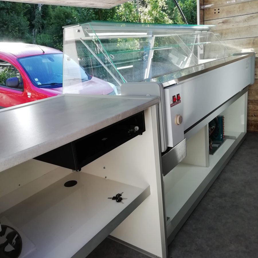 Plan de travail, comptoir de vente avec tiroir-caisse, nombreux rangements dont 1 grand placard avec portes coulissantes & fermeture à clés, tableau électrique, prises, passe-câbles intégrés,