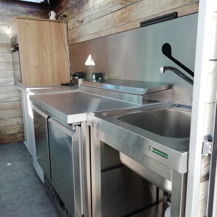 Table de rinçage avec étagère en acier inoxydable 60x60cm équipée d’une douchette & mitigeur, pompe électrique intégrée, chauffe-direct électrique (eau chaude), arrivée d’eau extérieure par robinet vanne quart de tour, réserve d’eau claire 16L, distributeur savon mousse conforme à la demande des services sanitaires, dérouleur à papier,