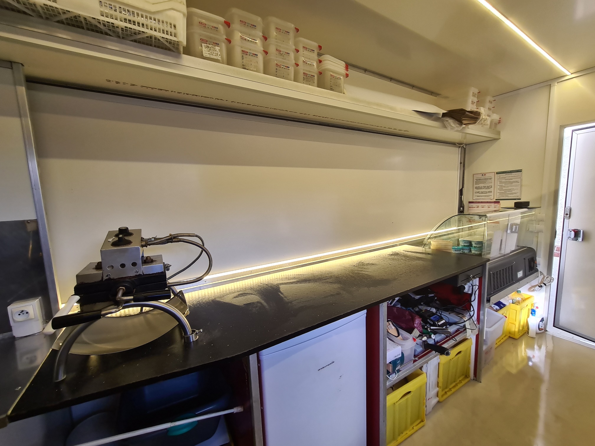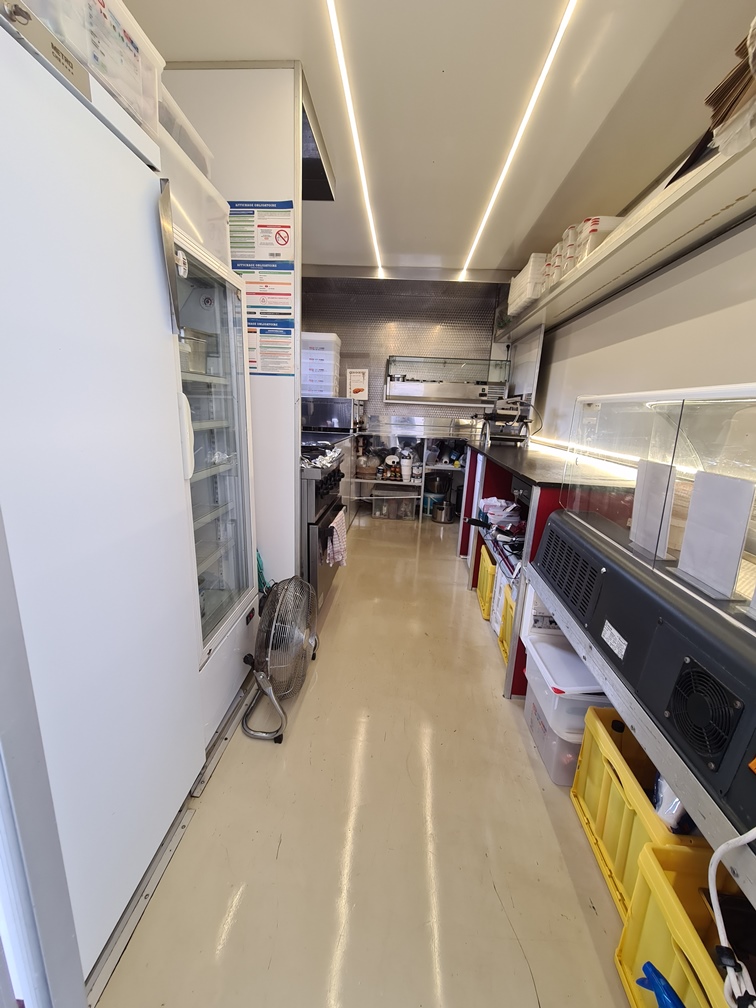 Aussi : 1 saladette pro 5 bacs en inox en hauteur et 1 plan de travail en fond de remorque