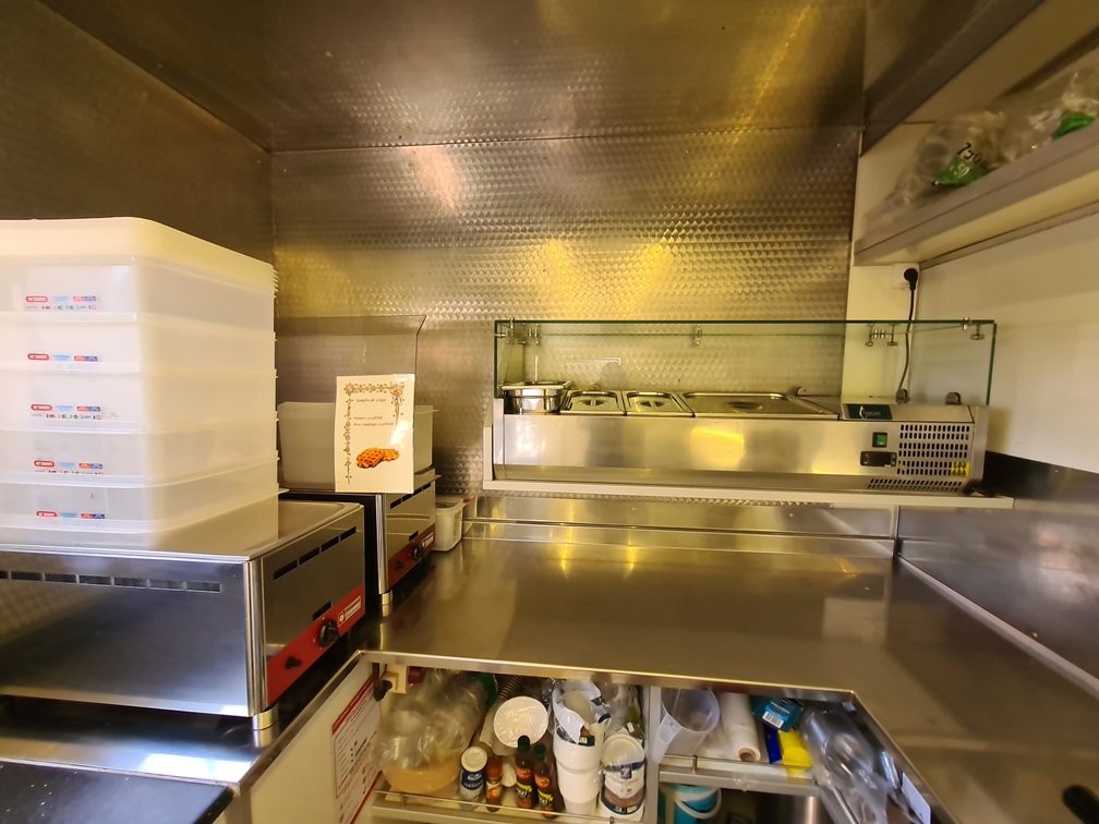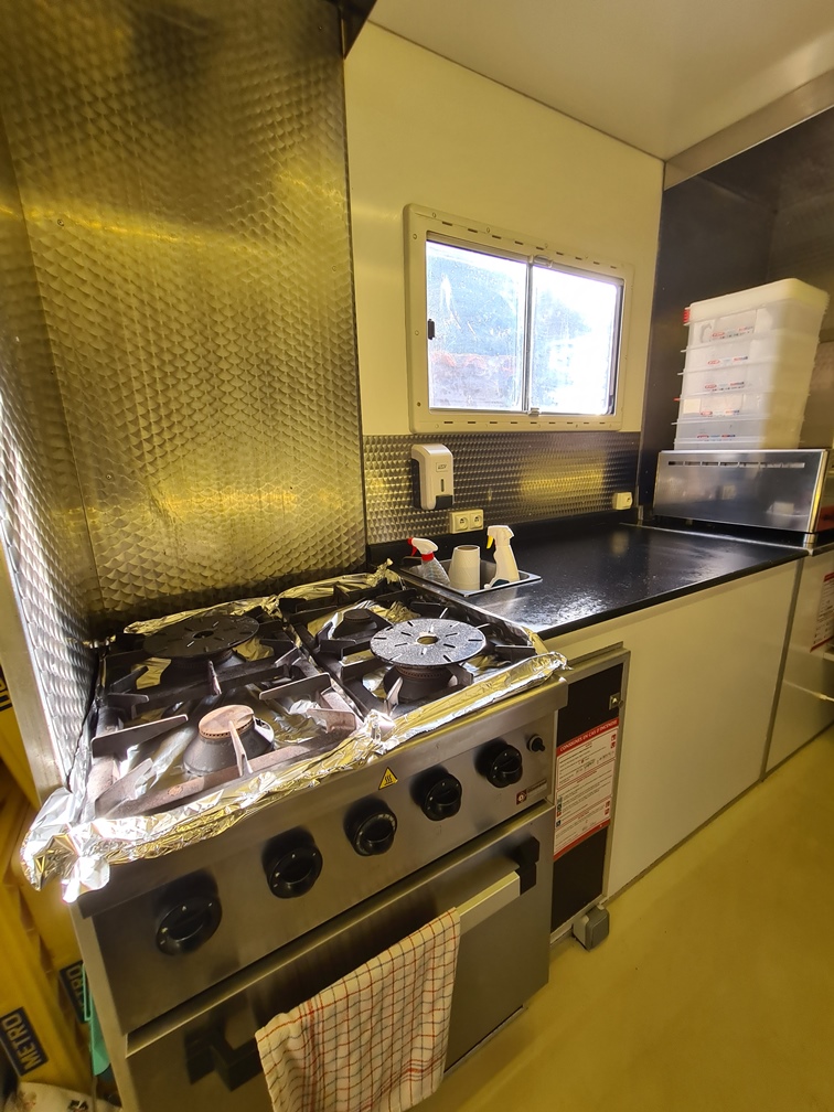 2 frigos pro (1 fermé et un vitré), 1 fourneau à gaz à 4 feux vifs et 1 four, 1 espace sanitaire avec distributeur de savon, 1 hotte d’extraction de fumée, 1 lave-main avec réserve eau de 4L en dessous (alimentation par pompe), 1 plan de travail, 2 bains-marie au gaz GN 1/1 marque BMG
