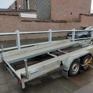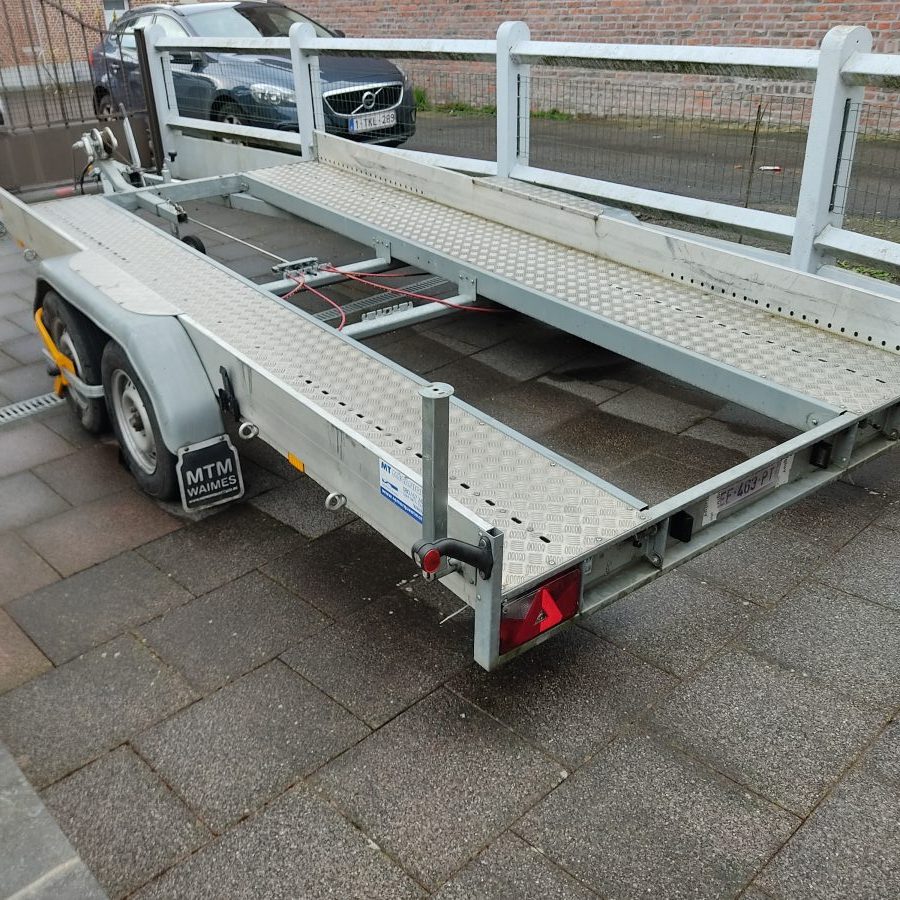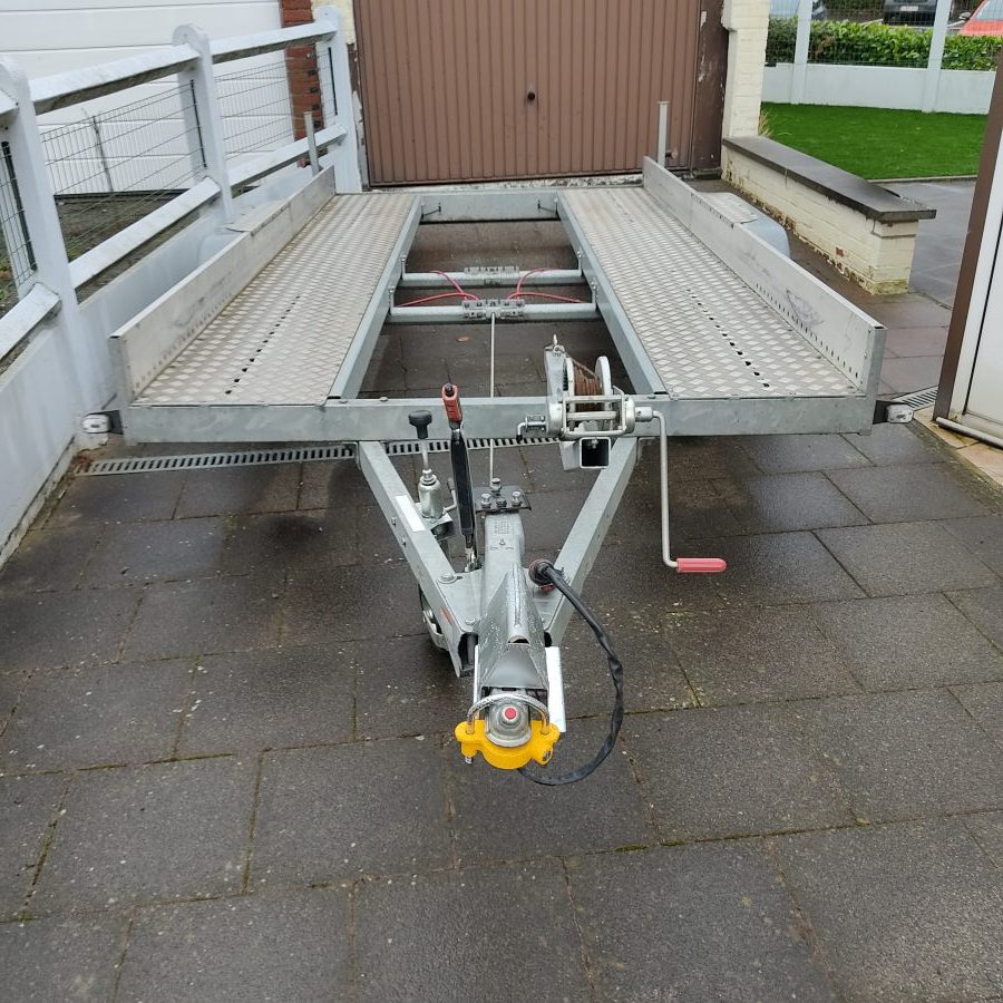 treuil – plateau alu – rampes de 2,4 m logées – timon AL-KO . Accessoires barre d’arrêt + sangles de transport et matériel de sécurisation (fausse boule, cale pneu, protège timon)