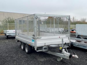 T35-35 – REMORQUE BENNE/PORTE-ENGINS 2 ESSIEUX FREINES + REHAUSSES GRILLAGEES H 100 CM+ ROUE DE SECOURS + COMMANDE A DISTANCE